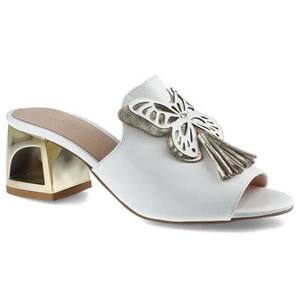 Klapki damskie Damiss, naturalna skóra licowa z dekoracyjną aplikacją w formie motyla i frędzli oraz stabilnym obcasem o geometrycznym kształcie, białe, DS-521-8
