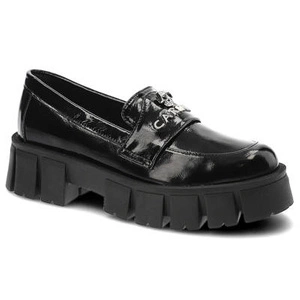 Półbuty damskie Carinii, skóra naturalna lakierowana z ozdobnym pasem i srebrnym metalowym napisem na grubej płaskiej podeszwie, czarne, B7626_-037-000-000-E84