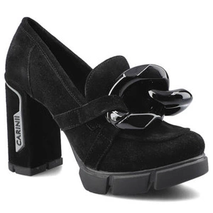 Półbuty damskie Carinii, Wykonane z naturalnej skóry zamszowej z miękką cholewką klasycznym wycięciem ozdobnym metalowym elementem na przodzie oraz masywnym stabilnym obcasem i platformą o prostym profilu., czarne, B7322-K-H20